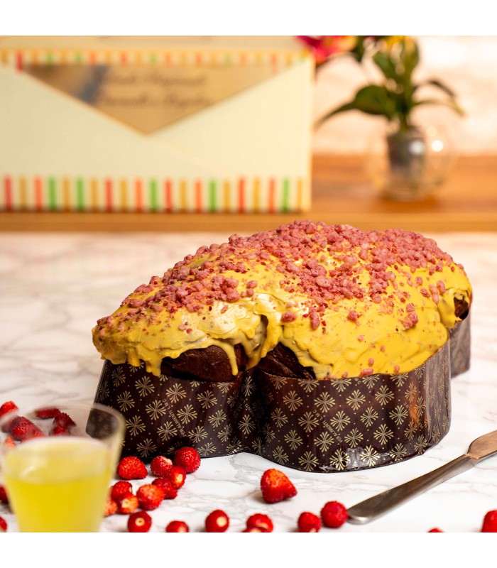 Ingredienti: farina grano tenero 00, acqua, zucchero, burro, tuorli d’uovo, lievito naturale, miele, sale, malto, arancia candita, fragoline di bosco semicandite 11%, limone di Amalfi candito 11%, pasta agrumi naturale, vaniglia naturale Limoncello 15%.