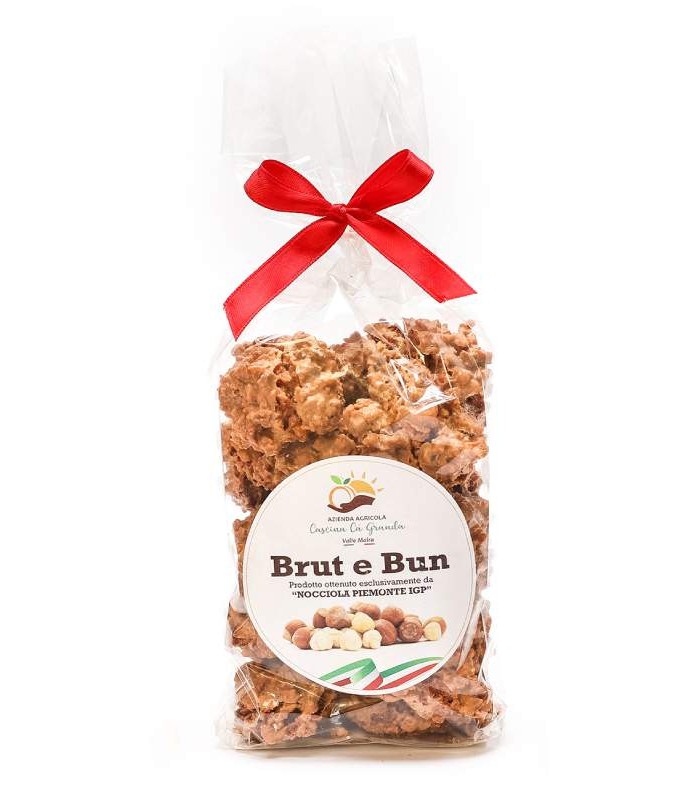 Nella preparazione dei Brut e bun le nocciole non devono essere ridotte in polvere come per altre preparazioni, ma bensì in granella per questo il biscotto si presenta ruvido, spesso e forma una piccola cunetta.
